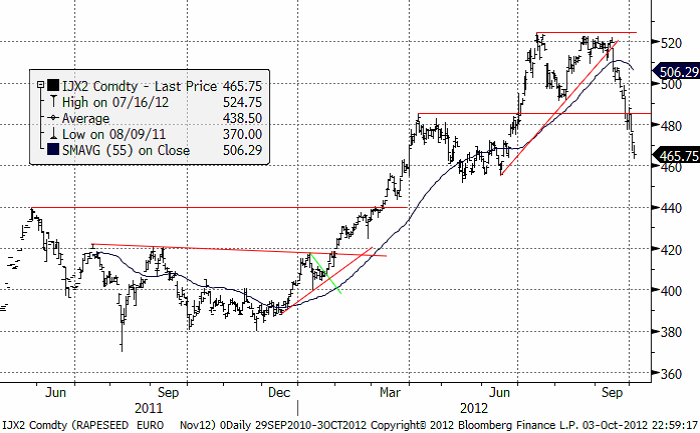 Vetemarknaden har fortsatt att röra sig väldigt lite. Tekniskt är den gamla triangeln ett motstånd för prisuppgångar. Det finns uppenbarligen gott om säljare i Matifs novemberkontrakt på nivåer nära 270 euro per ton. Det är osäkert om den här ”sidledes” rörelsen är en konsolidering inför ytterligare en prisuppgång – eller en toppformation. Tekniskt ser det ut att vara högre sannolikhet för att det är en topp-formation.