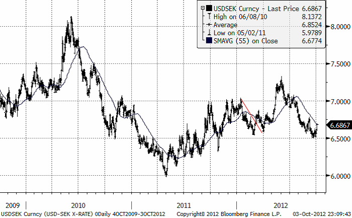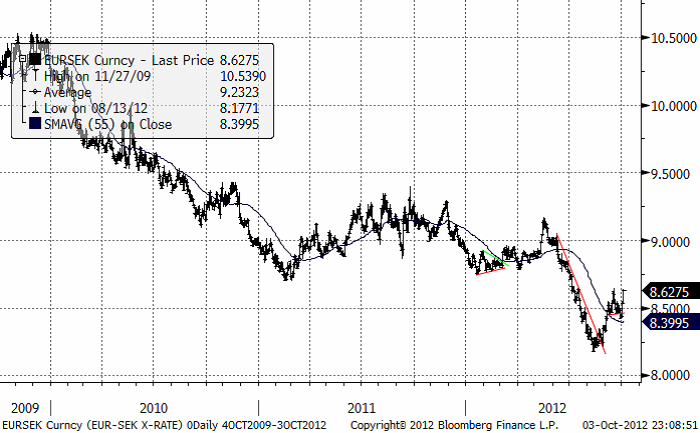 EURSEK-trenden pekar uppåt. Det talas i pressen om att kronan är den mest övervärderade valutan av alla OECD-valutor. Att Sverige skulle klara sig jättebra, när resten av Europa har problem, och flera länder i södra Europa egentligen varit i konkurs i två år, är inte sannolikt.