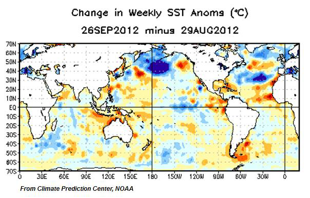 Temperaturerna har sjunkit i Stilla Havet och gått till för ENSO neutrala värden. Nedan ser vi en bild på förändringen i temperatur mellan 29 augusti och 26 september.