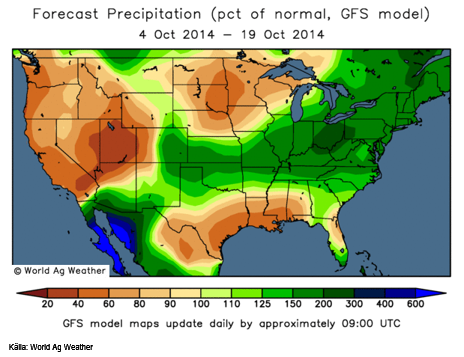 Prognoskartan för nederbörden i USA visar torrt väder i ’corn belt’ och blötare typiska veteodlingsområden som Kansas och Oklaholma.
