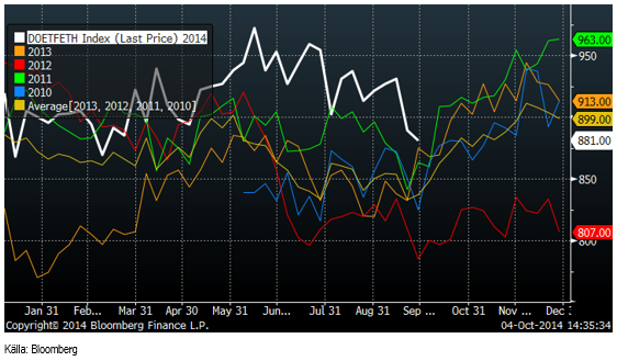 DOE rapporterade i veckan som gick att etanolproduktionen i USA sjönk igen, som vi ser i diagrammet nedan. Hösten är en säsongsmässigt svag period och produktionen kommer säkerligen att ta mer fart från mitten av oktober.