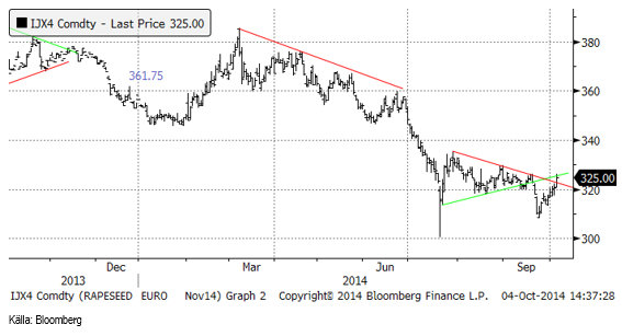 Novemberkontraktet för rapsfrö som ”skulle” ha rekylerat ner igen, gick rakt igenom tekniskt motstånd, upp till 325 euro i fredags. Det är samma höga nivå som priset hade innan det föll kraftigt ner mot 300 euro i september. Priset ”borde” gå ner igen från den här nivån.