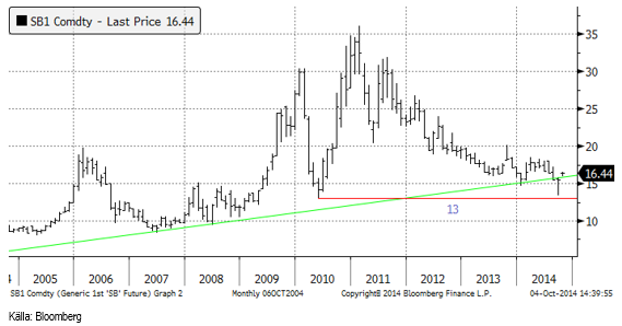 Nedan ser i prisutvecklingen för spotkontraktet de senaste tio åren. Prisfallet tog ner råsockerpriset till 13 cent, som utgjorde bottennoteringen år 2010. Det var en nivå där köpare dök upp och det skedde samtidigt som väderleksprognosen för Brasilien såg allt torrare ut. Det är torrt även i nordvästra Indien, som också är centrum för den indiska sockerrörsodlingen. Indien och Brasilien är världens största producenter av socker.