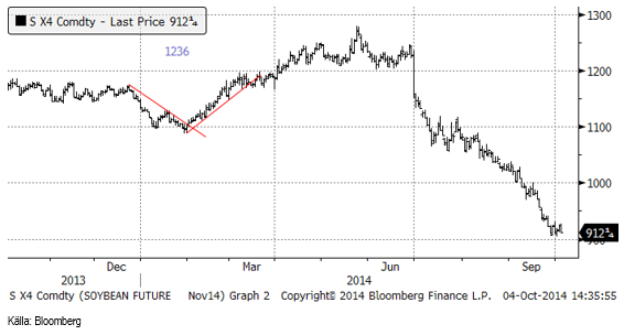 Sojabönorna (SX4) har under september fallit från 1000 cent ner till 912. Det verkar som om det finns stöd för priset vid 900. Bryts det, finns nästa stöd vid 800 cent.