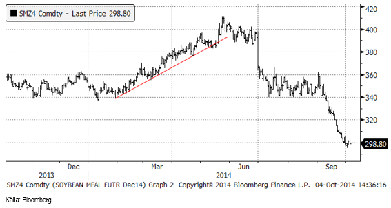 Sojaoljan har fallit i pris med ungefär 25% sedan i våras (för ny skörd). Den fallande pristrenden bröts för en månad sedan och sedan des har priset stabiliserat sig strax över 32 dollar och med ett tak på 34 dollar. Prisfallet lär ha kylt av all expansion av palmoljeoldling och därmed kan en rekyl uppåt i priset på vegetabilisk olja motiveras. För sojaolja är det i så fall till 36 eller kanske 38 dollar. På dessa nivåer finns starka motstånd, där 38 dollar är det starkare av de två.