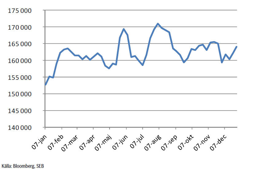 Nedan ser vi genomsnittet under året av ”Commercial Net Short Futures Position” enligt CFTC:s data.