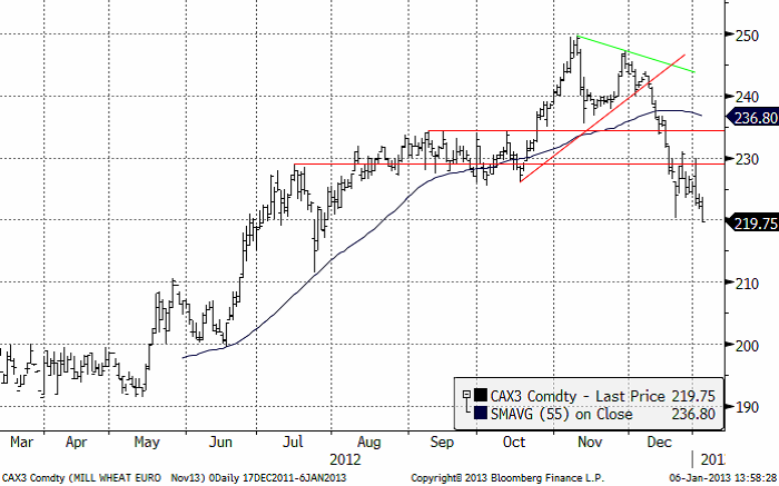 Nedan ser vi kursdiagrammet för kommande skörd, november 2013. Priset bröt den uppåtgående stödlinjen vid strax över 240 euro per ton som en respons på WASDE-rapporten. Därefter har priset fallit ner till stödlinjen vid 235 euro. Där fanns köpare. Det är möjligt att det kommer en rekyl uppåt i veckan. Vi anser att den rekylen uppåt i så fall är ett säljtillfälle, och rekylen bör maximalt, enligt den tekniska analysen, gå upp mot 240 euro, men troligtvis inte över.