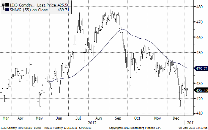 Rapspriset (november 2013) har en teknisk stödnivå strax under dagens kursnivå. Priset ligger strax över förra årets bottennoteringar. Det rapporteras från Indien att förnyad torka i landet sätter rapsskörden i farozonen.