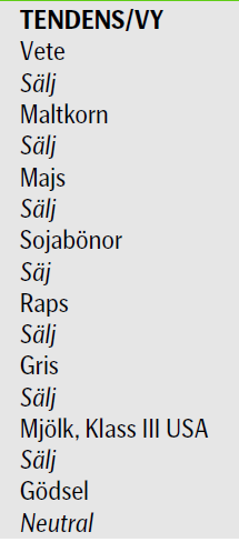 Samtidigt hopar sig hoten inför våren och sommaren i form av exceptionellt dålig form på höstvetet i USA och ihållande torka och redan mycket låga lager av gammal skörd. Vi förbereder oss därför på att gå över till i första hand en neutral rekommendation, eventuellt om en vecka.