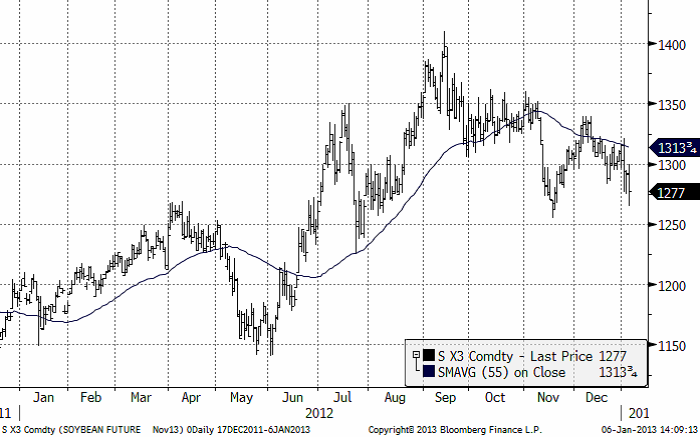 Till skillnad från spannmålen majs och vete har sojabönorna fallit endast lite sedan december. Sojamjölet föll 7% förra veckan, medan sojaoljan gick upp med 2%. Farm Bill från 2008 förlängdes eftersom den som blandar i biodiesel i dieselbränslet får behålla en dollar i skatterabatt per gallon. Det var inte många som räknat med det.