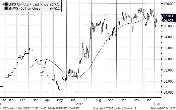 Grispriset (Maj 13), amerikansk Lean Hogs, har haft en fin prisuppgång sedan i somras. Trenden har dock förlorat nästan all sin kraft. De senaste tre månaderna har priset egentligen rört sig ”sidledes”, vilket kan vara slutet på uppgångsfasen. Fallande pris på majs och sojamjöl bör, allt annat lika, leda till högre grisproduktion och därmed lägre priser.