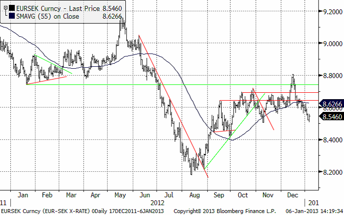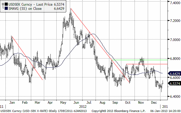 Dollar stärktes något märkligt av den halvmesyr som undvikandet av ”Fiscal Cliff” innebar. Den politiska uppgörelsen i USA innebär endast att beslutet skjuts upp två månader. Med tiden kommer Fiscal Cliff återigen galopperande. Ironiskt nog innebär uppgörelsen att de federala utgifterna höjdes. Inte sänktes.