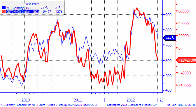 Spekulanterna har tagit fasta på att ”höga priser” stimulerar mer produktion och sålt terminer kraftigt. Den röda linjen i diagrammet nedan visar nettopositionen för kategorin terminshandlare som klassificeras om ”non-commercials” i CFTC:s sammanställning. Den blå kurvan är priset på spotkontraktet på CBOT.
