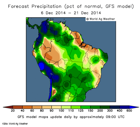 Nederbörden i Brasilien fortsätter att vara rikligare än normalt även den kommande tvåveckorsperioden. Även Argentina fortsätter att få riktlig nederbörd.