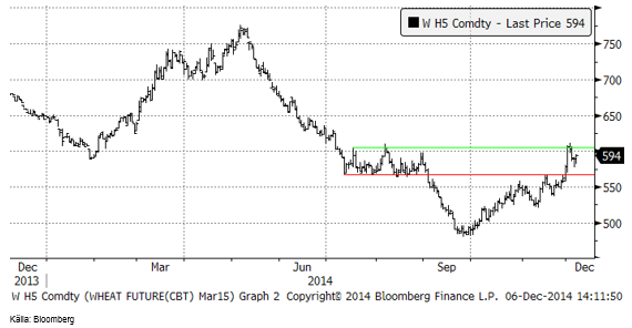 Matifs termin för december 2015 handlas i 196 euro per ton, motsvarande 1819 kr per ton. Detta är både i ett historiskt perspektiv och mot bakgrund av årets prisnivå, ett attraktivt pris att terminssäkra nästa års skörd till. Ännu bättre är förmodligen att göra detta via Chicagos veteterminer, som generellt sett alltid handlas på en lägre nivå, men som också uppvisar ett stort contango på 7% på årsbasis. Priset där är drygt 1700 kr / ton och det skall alltså ses mot bakgrund av att prisnivån generellt är lägre.