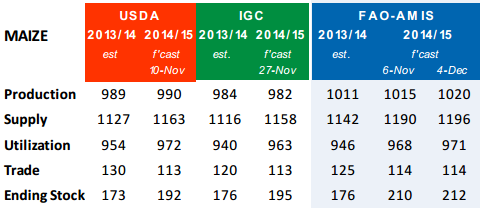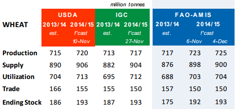 FAO / AMIS rapporterade i torsdags den 4 december. De höjde produktionsestimatet från 723 mt till 725 mt hänförligt till EU och Ryssland och höjde också utgående lager med 1 mt (huvudsakligen i Ryssland +3.3 mt och i Kina +3 mt).
