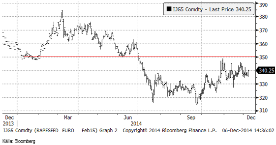 Februarikontraktet på rapsfrö steg med 3 euro under veckan till 340 euro.