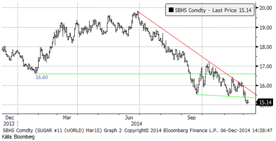 Priset marskontraktet på NYBOT föll under den tekniska stödnivån och nådde ner till 15 cent där priset fann stöd. Tekniskt är trenden nedåtriktad och ur det perspektivet skulle priset gissningsvis fortsätta ner.