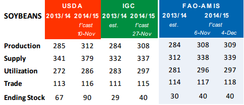 FAO / AMIS höjer global produktion av sojabönor med 1 mt, hänförligt till högre hektarskörd i USA. De lämnar dock utgående lager oförändrat på 40 mt.