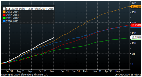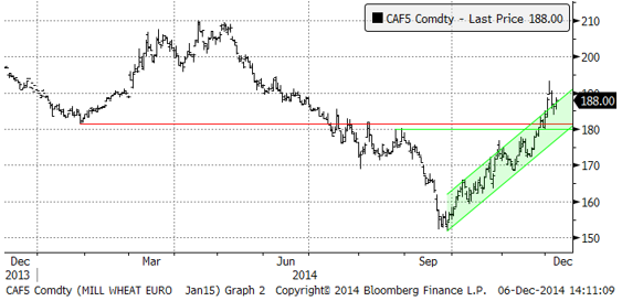 Nedan ser vi prisutvecklingen på nästa års decemberkontrakt på Matif (de har bytt från november till december som förfallomånad).