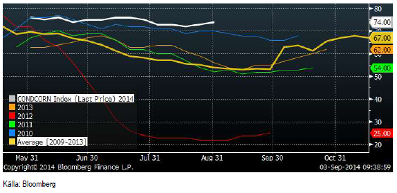 På torsdag, den 11 september, publicerar både USDA och FAO/AMIS sina rapporter för september. De kommer förmodligen att innebära höjningar av majs- och sojaproduktionen i USA och av spannmålsproduktionen i Ryssland. Konsumtionen kommer antagligen inte att höjas lika mycket, eftersom geopolitisk oro och redan drabbade producenter av gris och mjölk håller tillbaka konsumtionen. Därför kommer antagligen utgående lager att justeras upp märkbart, med prisfall som följd.