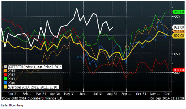 I fredags morse rapporterade Reuters att Ryssland Grain Union (RGU) med hänvisning till ett läckt brev från premiärminister Medvedev, att ryska jordbruksdepartementet överväger att införa ett exportstopp på vete under 2014/15. Detta ska ses mot bakgrund av att spannmålsskörden ser ut att bli över 100 mt, och att Ryssland redan exporterat 7.3 mt spannmål sedan den 1 juli. Enligt brevet som RGU citerar skulle exportstoppet slå till om exporten når 26.9 mt. IKAR och ProZerno har båda förutspått en export på 33 mt i år, så vi bedömer att den här informationen om ett exportstopp stämmer. Priset på spannmål är lågt och det råkar ha varit bra väder i år, samtidigt som Ryssland de facto befinner sig i krig med ett av EU och USA uppbackat Ukraina. USDA ligger som bekant väsentligt lägre i sitt produktions- och exportestimat för Ryssland. Det kommer de säkerligen att justera upp i den kommande WASDE-rapporten. Det här brevet kan vara ett ryskt försök att ”snacka upp” priset, men det kan också ligga någon sanning i det.