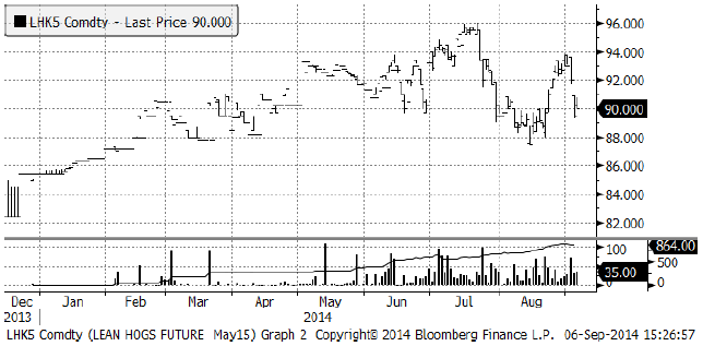 Oktoberkontraktet på EUREX Hogs ligger kvar på samma pris som förra veckan, 1.60 euro per Kg.