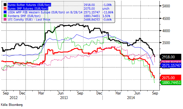 EUREX-noteringarna på smör och SMP fortsatte prisfallet. Spotkontraktet på smör noterades i fredags i 2918 euro och SMP i 2075. Det är väsentligt under Fonterra-auktionens priser.
