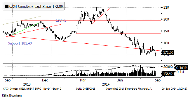 Matifs novemberkontrakt fortsatte inledningsvis på veckan det prisfall som inleddes i slutet av augusti, men fann stöd strax under 170 euro och handlades i fredags upp till 172 vid stängning klockan 18:30.
