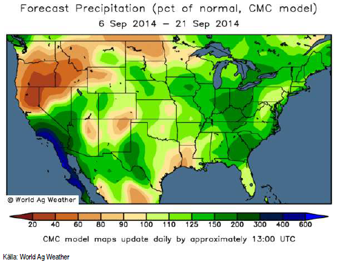 Prognosen för Ryssland och Ukraina som förra veckan var rätt torr, visar nu mer inslag av regn. Särkilt i det sydöstra hörnet av Ukraina, som Ryssland delvis har invaderat, väntas upp till 2 gånger normal nederbördsmängd. Stora delar av Ryssland får dock hälften eller mindre än hälften av normal nederbörd, vilket underlättar skördearbetet (vårvete och majs).