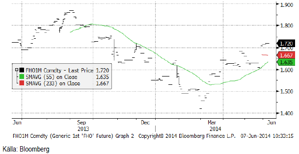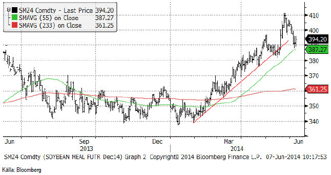Vi tycker inte att något har förändrat sig. Konsumtionstillväxten i Kina borde fortsätta att mattas och skörden borde fortsätta att justeras upp. Gammal skörd är alltjämt ”tight” och det kanske hänger kvar så länge situationen i den är aktuell. Så vi fortsätter att rekommendera sälj på sojabönor (november). Crop condition för sojabönor börjar rapporteras den 9 juni.