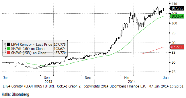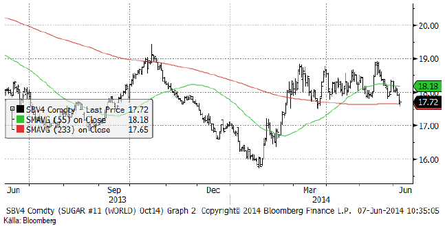 Vi går nu över från att följa juli-kontraktet på råsocker till att följa oktober-kontraktet, SBV4. Som vi ser lyckades inte priset gå över 19 cent vid det senaste försöket att stiga. Som vanligt när luften går ur ett försök att bryta sig ur dödläget blir motreaktionen å andra hållet lite kraftigare. Priset stängde i fredags på 17.72 cent per halvkilo. Priset ligger fortfarande inom den ”trading range” som priset pendlat inom sedan början på mars.
