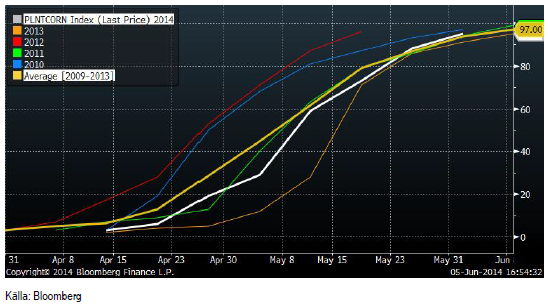 Sådden av majs i USA var per den 30 maj klar till 95%. Som vi ser är den senare delen av sådden klar i normal takt – eller faktiskt marginellt snabbare än ”normalt”. Det mesta var faktiskt sått före mitten av maj, vilket anses vara en garanti för att det ska bli avdrag på skördens storlek.