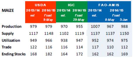 USDA rapporterar på onsdagen den 11 juni. Förväntningarna är att det mycket gynnsamma vädret i USA ska bära fram en rekordskörd på 13.939 miljarder bushel. FAO/AMIS rapport från tidigare i veckan återspeglar dessa förväntningar med en rätt stor höjning av global produktion av majs från 967 mt den 8 maj till 988 mt den 5 januari. AMIS justerar upp utgående lager från 162 mt till 169 mt.