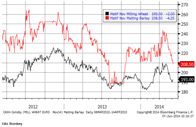 Maltkornsterminen för leverans i november har rasat i pris den senaste månaden, från 240 euro per ton till 208.50. Premien över Matifs vetetermin har också rasat och är nu bara 15 euro (från tidigare 30).