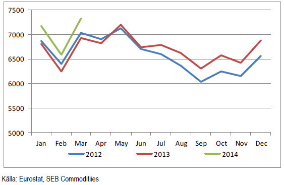 Produktionen ökar även i Europa. Nedan ser vi produktionen per månad i tusen ton mjölkråvara för några länder (Sverige, Finland, Danmark, Tyskland, Holland, Belgien och Frankrike) i norra Europa, Frankrike dock inkluderat. Det är i princip dessa länder som utgör marknadsområdet för EUREX terminshandel på smör och skummjölkspulver. Data sträcker sig fram till och med mars 2014. Produktionen i mars 2014 var 5.8% högre för dessa länder, som ligger i vad som börjar kallas för ”mjölkbältet” i Europa.