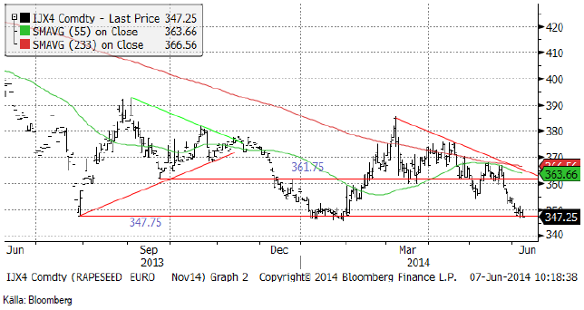 Novemberkontraktet på Matif föll hela vägen ner till ”den absoluta botten” på 347.75 euro. Faktum är, som vi ser i diagrammet nedan, att priset i fredags faktiskt stängde under den nivå som priset inte skulle kunna gå under. Det gjorde priset i och för sig även i januari, så vi har inte något riktigt brott nu. Det naturliga i lägen som dessa är att köpare tycker att det är billigt samtidigt som lantbrukare avhåller sig från att sälja därför att det är för billigt, i deras ögon. Så får vi en rekyl uppåt. Min till skillnad från läget i vete, tror jag inte att det är en lika allmän uppfattning bland lantbrukare att raps är för billigt på 347 euro. En del kan nog tänka sig att sälja även på den här nivån, så gissningsvis får vi nu ett brott nedåt och om det sker kan det gå fort utför.