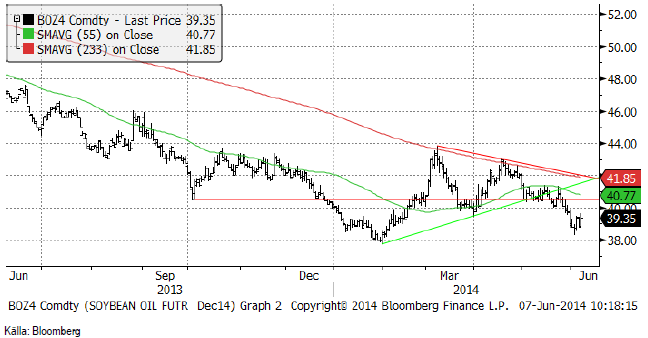 Sojaoljan har rent tekniskt brutit stödet det vilade mot, fallit ner nästan till stödet och den riktiga botten på 38 dollar. Därefter har en liten rekyl uppåt kommit. Det är ett klassiskt mönster. Om historien upprepar sig kommer vi att få se ett nytt test av botten på 38 och ett brott nedåt från den nivån.