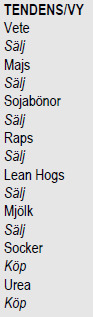 Än så länge ligger vi dock kvar med säljrekommendation, men det mesta talar för en rekyl uppåt i veckan som kommer. Än så länge tycker jag man ska se den rekylen som ett tillfälle att sälja, men om detta kommer att vara lika bra får vi återkomma till om en vecka, när vi fått lite mer väderstatistik, en WASDE-rapport och kanske de första skörderapporterna.