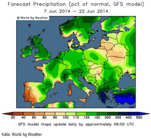 Europa fortsätter att vara mycket blötare än normalt. Grekland och Turkiet väntas få väsentligt mycket mer nederbörd än normalt, vilket knappast är bra för skörden där. Storbritannien, där en lovande skörd regnade bort totalt förra året, väntas få mer nederbörd än normalt fram till den 22 juni. Kontinentaleuropa verkar dock torka upp med normal eller något över normal nederbörd. Detta är inte typiskt för ett El Niño-år, som brukar innebära översvämning av de stora floderna i Europa. Mer om El Niño nedan. Över fjällen i Sverige och Norge väntas mer regn, vilket om inte annat kan sätta press på elpriset (igen).