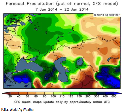 I veckan som gick fanns en oro för torrt och varmt väder i Ryssland. Som vi ser vänds detta i vart fall när det gäller nederbörden.