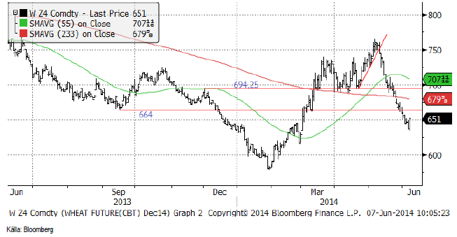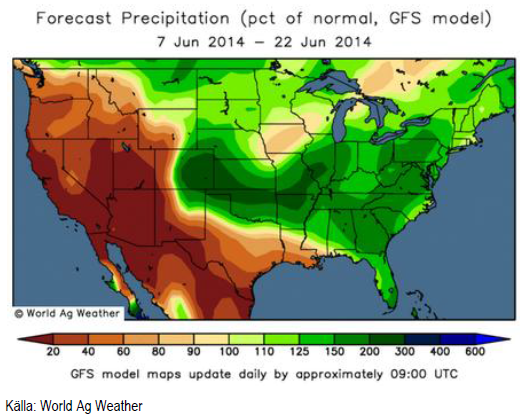 Odlingsvädret fortsätter att vara gynnsamt för att få fram en stor skörd av spannmål och oljeväxter på norra halvklotet. Priserna har fallit den senaste tiden, men fredagens handel på de amerikanska börserna slutade med förvånande styrka. Det är svårt att veta om detta beror på att handlare stänger korta positioner vid nivåer som ändå är nära historiska bottenpriser, inför en långhelg (de flesta länder har helgdag på måndag), eller om fredagens uppgång är starten på en rekyl uppåt. För att återkomma till odlingsvädret, kan detta ligga bakom uppgången i vetepriserna, då prognosen som ödets ironi visar onormalt mycket regn över Texas, Oklahoma och Kansas. Regn är inte nödvändigtvis bra just nu, när skörden där precis ska börja.