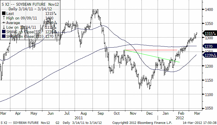 Novemberkontraktet gick efter en väldigt liten tvekan genom 13 dollar. Nästa motstånd finns på 1350 cent. Det är ovanligt med en så här pass lång och stadig trend uppåt, men när ska man gå emot?
