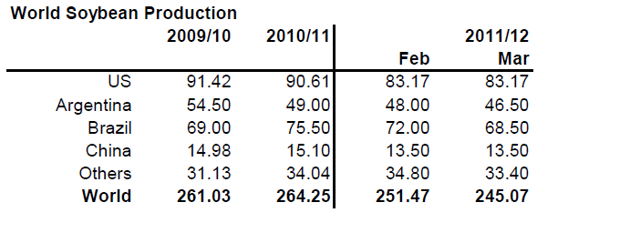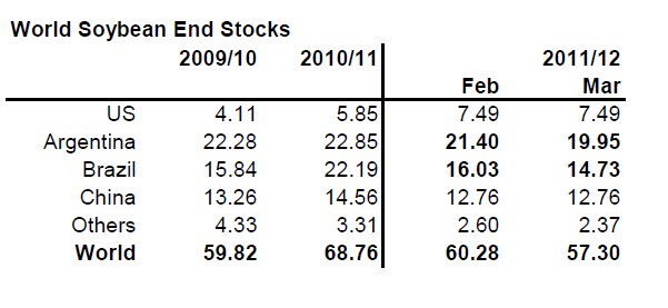 Utgående lager sänktes 3 mt, främst i Argentina och Brasilien. Pga de redan låga utgående lagren i USA har man på USDA valt att inte sänka USA:s lager.