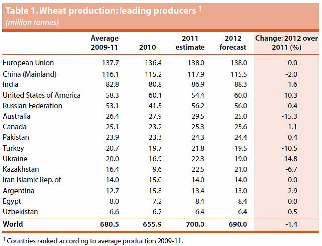 FAO’s första prognos över den globala vete produktionen för 2012 uppgår till 690 mt och blir därmed den näst högsta ur ett historiskt perspektiv. Jämfört med rekordåret 2011 är det en nedgång med 10 mt eller 1.4 procent men fortfarande en bra bit över genomsnittet för de senaste fem åren. Utsikterna för 2012 års globala vete produktion ser dock gynnsamma ut. Även om odlingen har ökat eller förväntas öka i många länder i år till följd av fortsatt starka priser, så förväntas en återgång till mer normala avkastningar i områden där rekordnivåer uppnåddes förra året. Men det är fortfarande tidigt att estimera den globala spannmålsproduktionen.