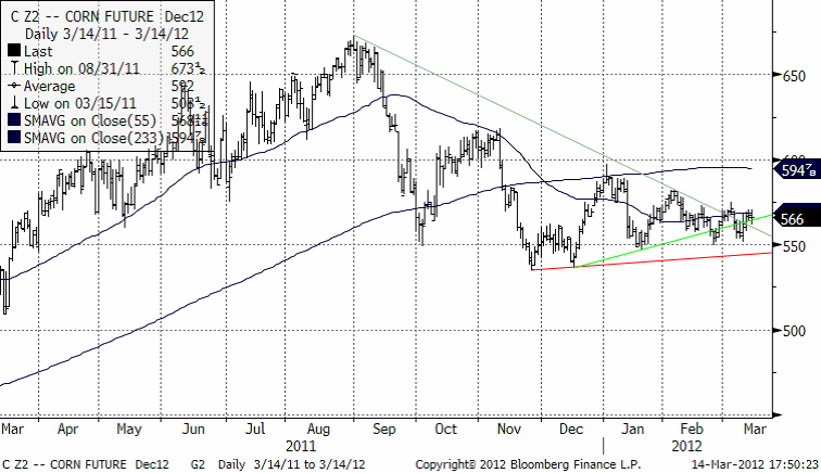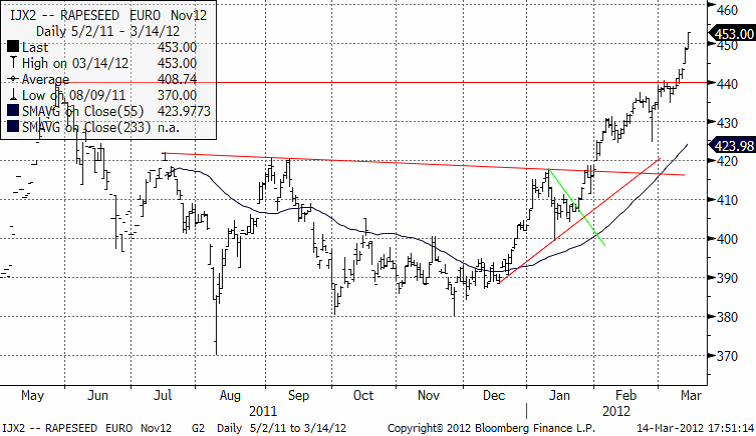 Vissa farhågor finns också hur den kraftiga kylan som har varit i Europa kommer att påverka rapsen. Det femåriga genomsnittet för EU’s rapsproduktion ligger på 19.5 mt och prognosen för 2012 från Europeiska kommissionen ligger nu på 20.2 mt. Andra privata analysfirmor uppskattar att produktionen kan bli så låg som 18 mt.