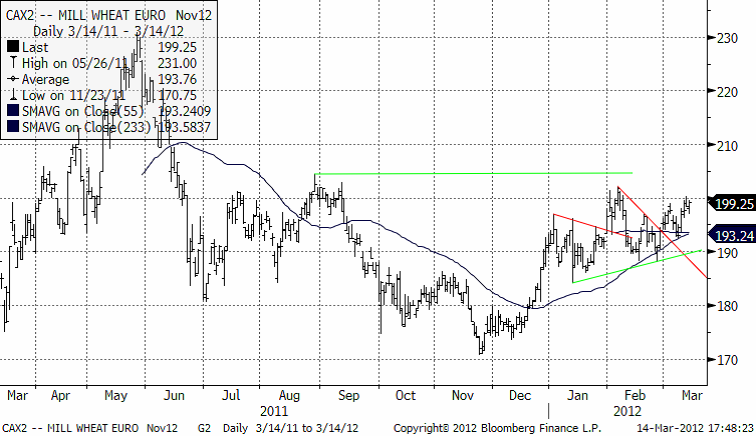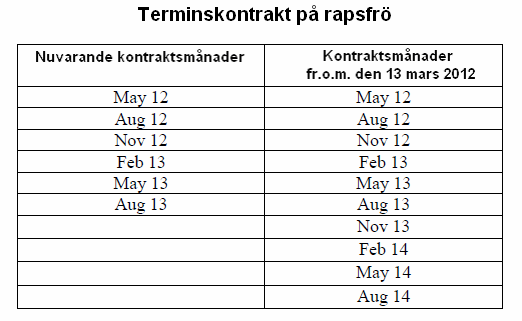 Den europeiska börsen Euronext (Matif) har utökat antalet kontraktsmånader för terminer och optioner på kvarnvete, maltkorn, rapsfrö och majs med fr.o.m. tisdagen den 13 mars 2012. En annan förändring som sker är också att kontraktsmånaden augusti för kvarnvete och maltkorn kommer att försvinna. Augusti 2012 blir därmed den sista noterade augusti månaden för dessa två råvaror. För kvarnvete och maltkorn kommer antalet kontraktsmånader att utökas från nuvarande 8 till 12 enligt nedan: