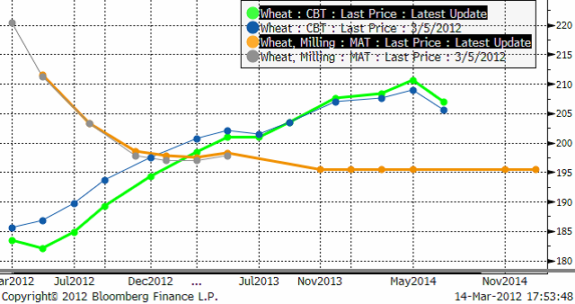 Detta gav en liten skjuts uppåt på priset. Inte så mycket för Kinas konsumtion, som för att utgående lager i USA väntas bli lägre. För vetepriset såsom världsmarknadspris är det USA som i egenskap av största exportör, är den helt avgörande marknaden. Vi såg fallande priser på terminer med kort löptid i USA, medan terminskurvan i Europa är helt oförändrad de senaste sju börsdagarna: