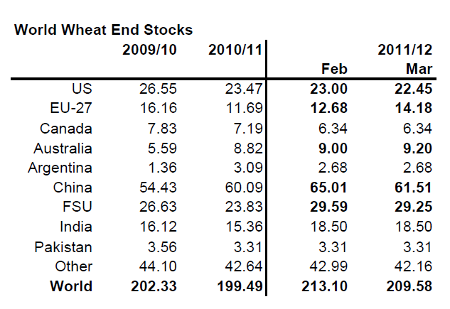Precis efter förra veckans veckobrev publicerade USDA sin WASDE-rapport för mars månad. Den visade ingen förändring. Kicki trodde först att de skickat ut februaris siffror av misstag, därför att det var nästan ingenting som skiljde (vi tittar först och främst på USA:s siffror, eftersom det är det största exportlandet och det är export och importmarknaden som avgör världsmarknadspriset). Men totalt för vete blev det en liten uppjustering av väntad skörd globalt sett: