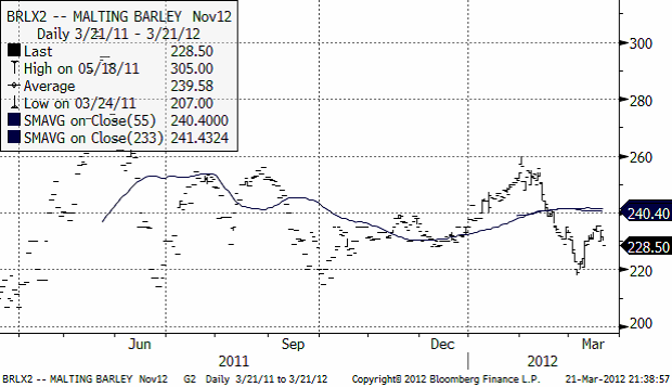 Novemberkontraktet på maltkorn har vänt ner, efter att ha rekylerat upp från 220-nivån.